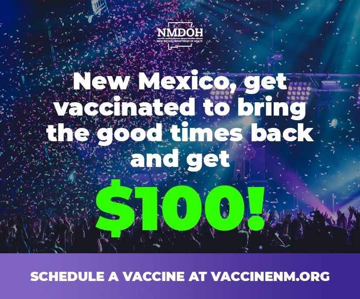 Help keep us on track to reach our target goal of a 60% vaccination rate. A $100 payment is being offered to New Mexicans who get their shot by tomorrow! Schedule your appointment right now at: http://vaccinenm.org?ref=trdvaccinenm.org/?ref=trd