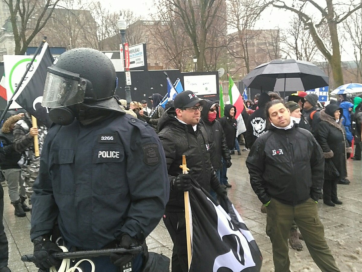 About half an hour ago, QC police ejected anti-racism protesters from René-Lévesque corner of #assnat with chemical irritants. Far right protesters were seen cheering from Old City walls at the same time @Linknewspaperpic.twitter.com/8IeW0BUOSq