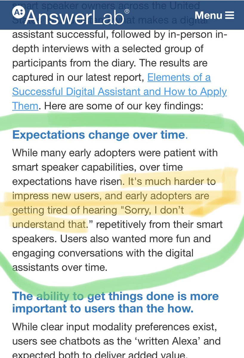 Great research coming out of @AnswerLab’s Lin Nei @ChrisGeison (*) New-new users have higher expectations (*) Early adopters/apologists getting tired of hearing “Sorry, I don’t understand...” Classic stages of reaching mass market critical mass. #VoiceAssistants #VoiceFirstpic.twitter.com/Ya5XHacPHc