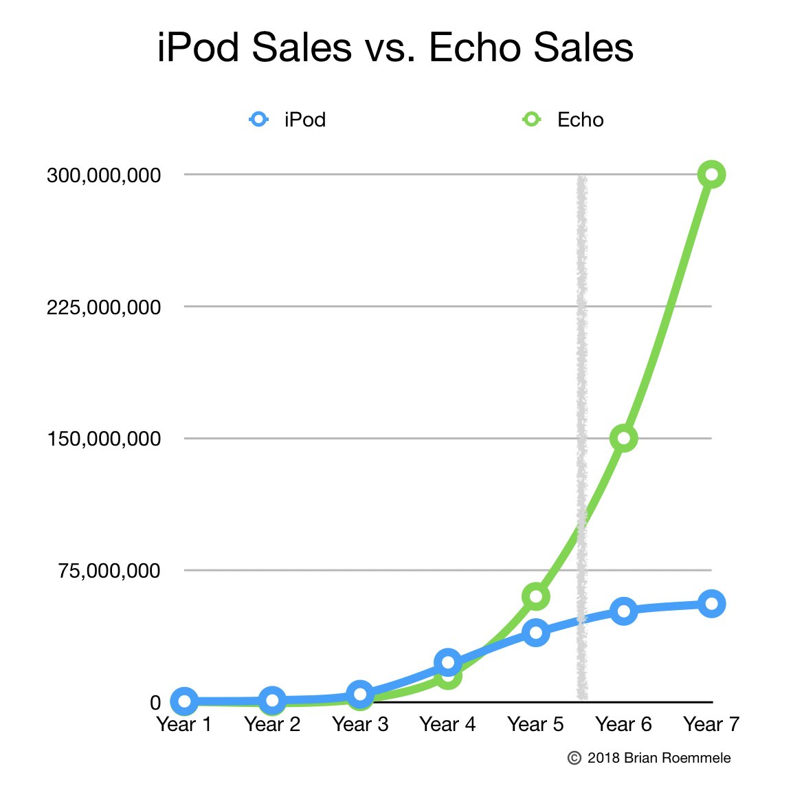 Just had an wonderful time chatting with the polymathic and amazing @reneritchie for the #VectorPodcast! We dive deep into Apple Music on Alexa and of course SiriOS. Specimen of Apple iPod sales vs Echo Sales from year of inception I spoke about in the show. Out soon!pic.twitter.com/lUSowFCdWa