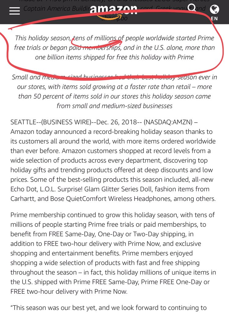 “This holiday season, tens of millions of people worldwide started Prime free trials or began paid memberships, and in the U.S. alone, more than one billion items shipped for free this holiday with Prime” Tens of millions NEW prime users. I assert more than 80% got an Echo.pic.twitter.com/zfrFdQo6re