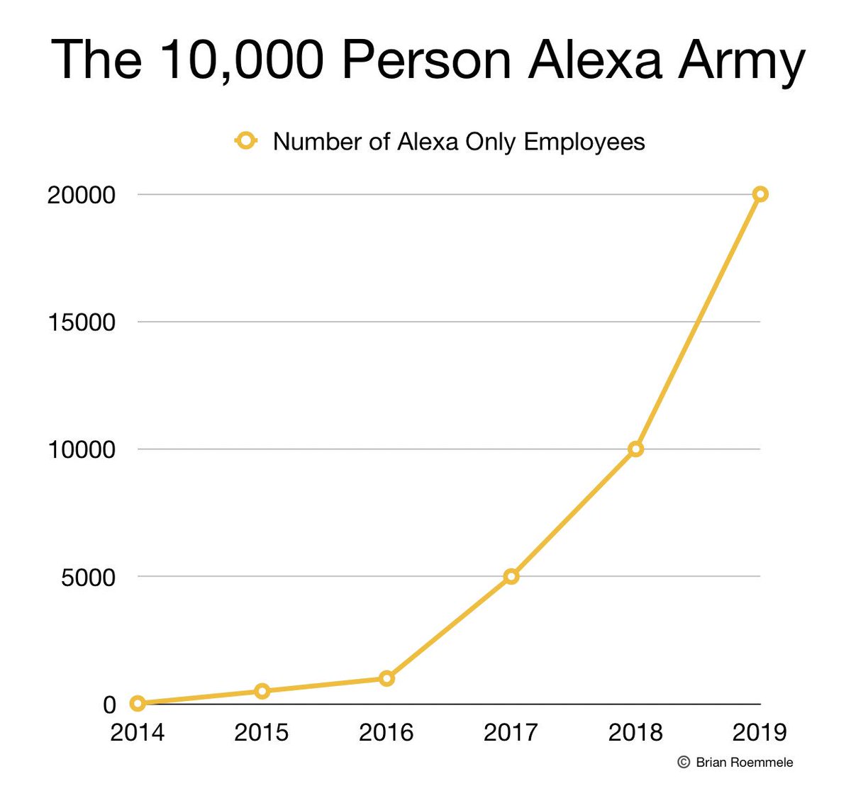I wrote about the 1000 person Alexa Army in 2016. Many folks in tech found this to be humorous, “what are they all doing”. I presented the reasons this would continue robustly. In 2018 it became a 10000 person Alexa Army. It will be ~20000 by the end of 2019.pic.twitter.com/kK75TDhDMg