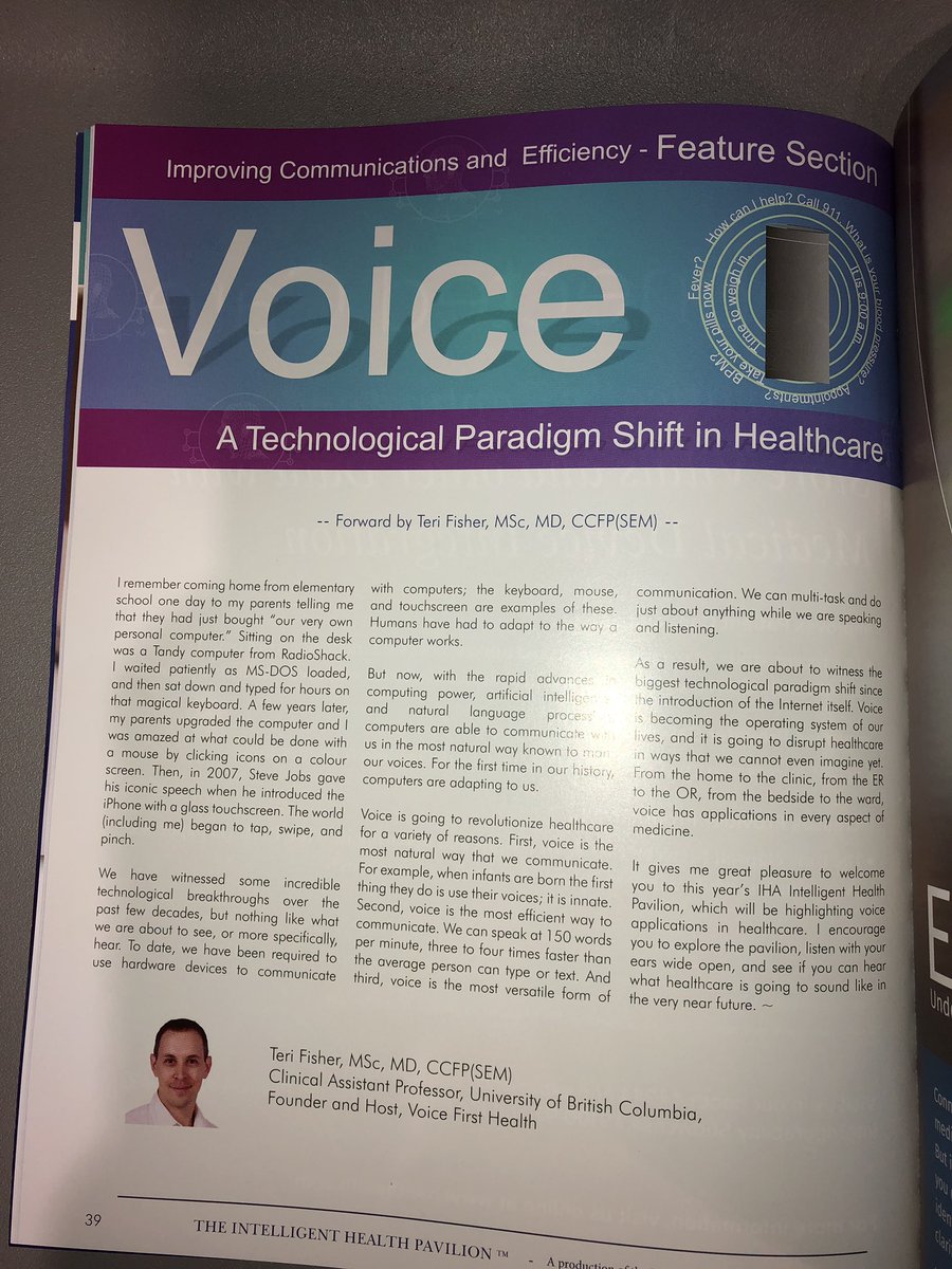 Thanks to the Intelligent Health Pavilion for inviting me to write the forward in this year‘s #HIMSS19 guide. This event is to feature #voice technology as a major technological paradigm shift in #healthcare. #voicefirst #ehealth #DigitalHealth http://VoiceFirstHealth.com/live pic.twitter.com/vf4v8MKLR7