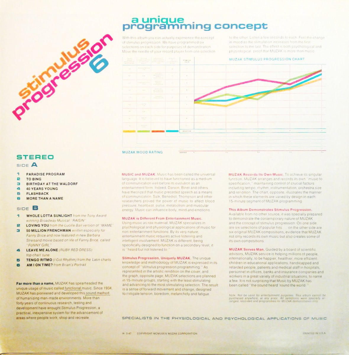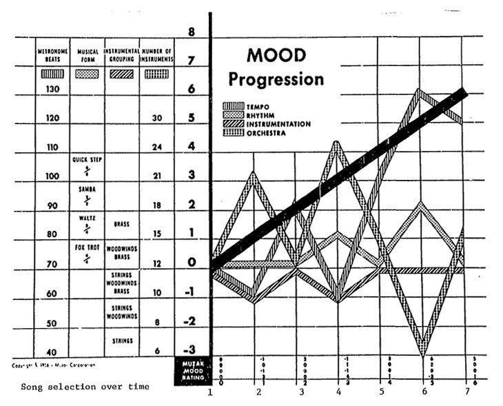 Many folks asked for a bit more Muzak research I own. A single study: The mood rating-from gloomy to ecstatic called The Stimulus Progression. Song sequences of 15-min blocks of 5 or 6 songs ascend in mood rating to provide a captive audience with a sense of forward movement.pic.twitter.com/n7Zds6Cu1R