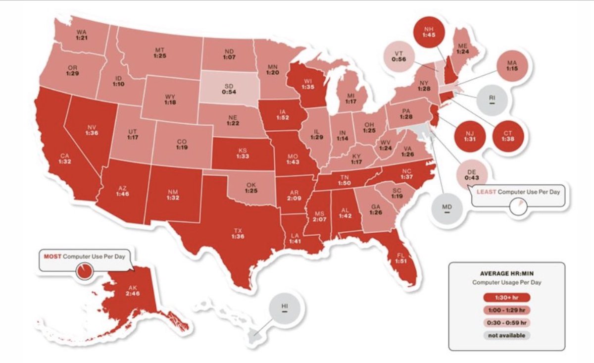 Fascinating study of time. This is what average folks are doing... Americans spend ~90 minutes of leisure time on the computer per day. Residents of Alaska spend ~2 hours 46 minutes a day on the computer that is ~42 days per year. The American Time Use Survey.pic.twitter.com/VqB4WUkZ1x