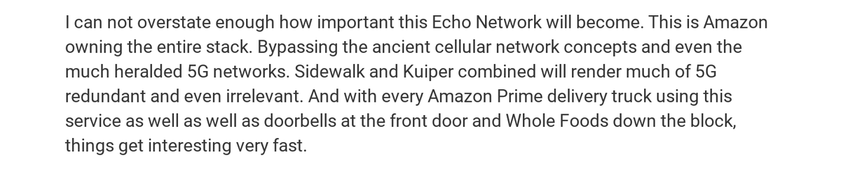 Now think about Amazon deploying a mesh of communication satellites and Blue Origin makes much more sense. The new internet for the connection of everything is being built by Amazon. 3/3https://www.geekwire.com/2019/amazon-ceo-jeff-bezos-sees-new-opportunity-yard-sidewalk-beyond/ …