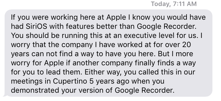 A really touching text message from a notable executive at @Apple. Thank you. Gratitude. My answer is I am ready to roll my sleeves up and help do my small part of SiriOS when Apple is. Or perhaps I can build it someplace else... https://twitter.com/BrianRoemmele/status/1184139581521743872 …pic.twitter.com/klcCfTNMAA