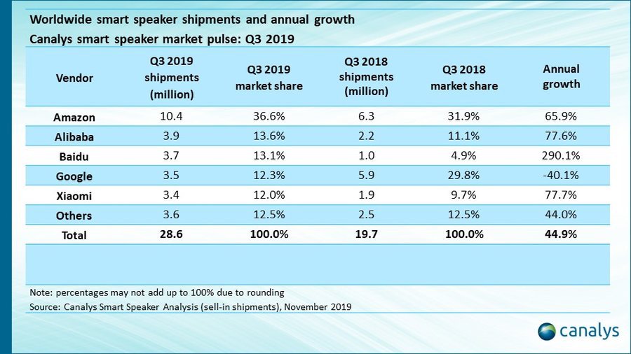 "The global #VoiceFirst market grew 44.9% by 28.6 million units in Q3 2019. Amazon pulled ahead of the pack by shipping 10.4 million smart speakers after emerging from a stellar Prime Day performance" pic.twitter.com/3i22rtDsEI