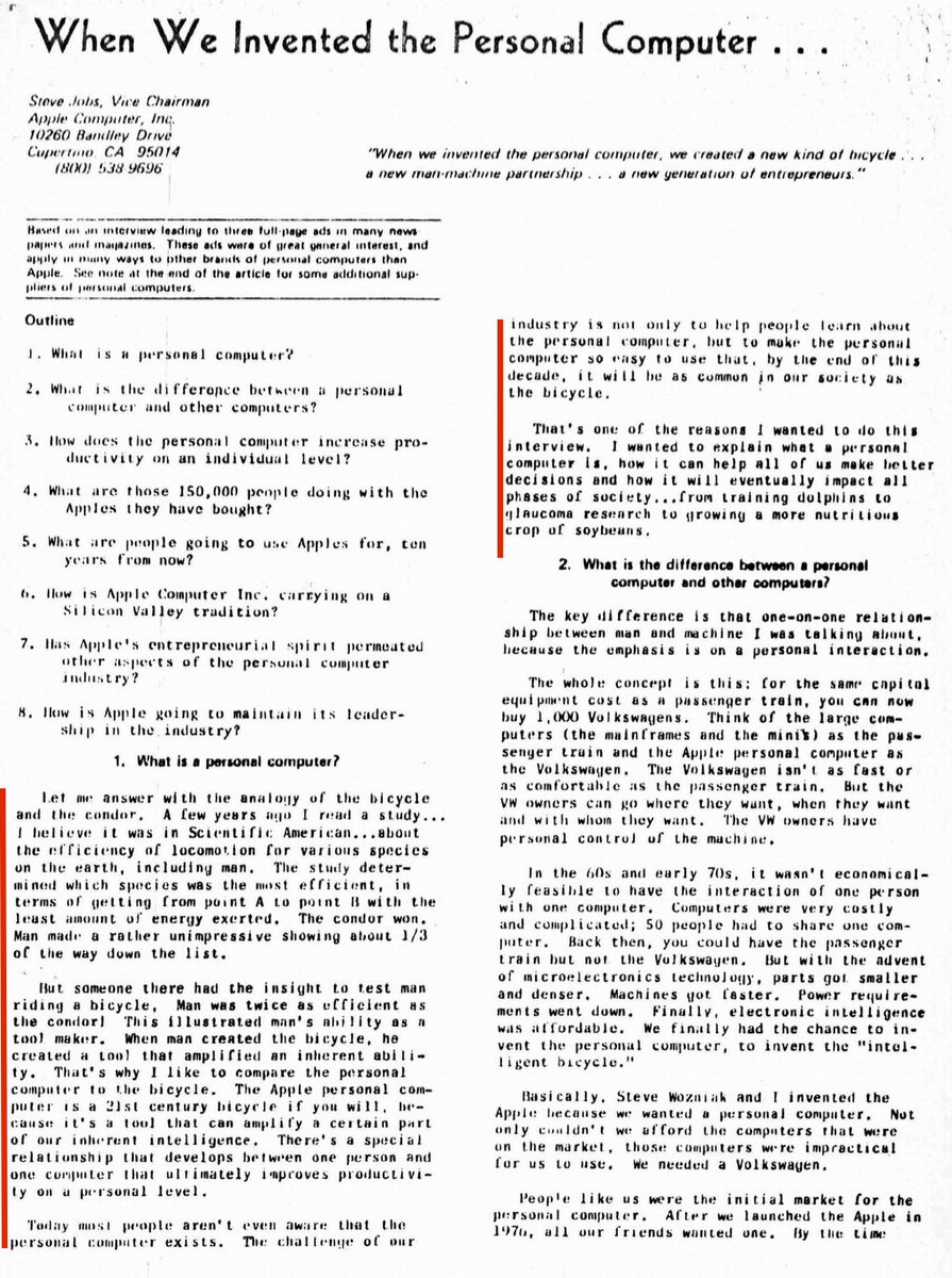 This is one of the first times Steve used the “Bicycle of The Mind” explanations in an interview. Steve wrote this himself on an Apple ][ in the late 1970s. It is an interesting expansion on this Scientific American quote. It was later used in an ad in Infoworld Magazine.pic.twitter.com/bSMRJbw45f