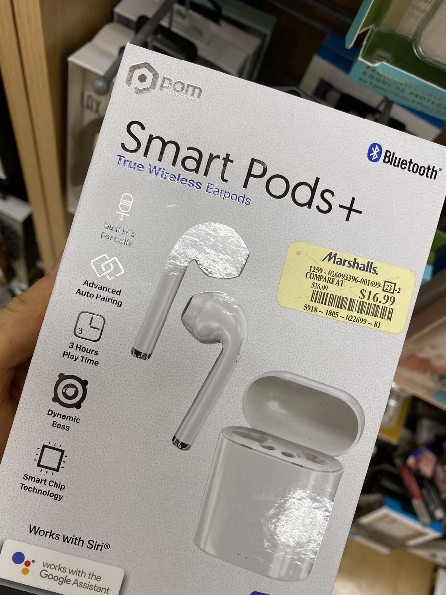 Meet Smart Pods + on sale now for the holidays for just $16.99! Found this on an electronics parts expedition at deep discount store @marshalls. It is hilarious and heartbreaking to see exquisite Apple inventions cloned. I will use some of the parts for my cheap AR glasses.pic.twitter.com/KmDfuxln4B