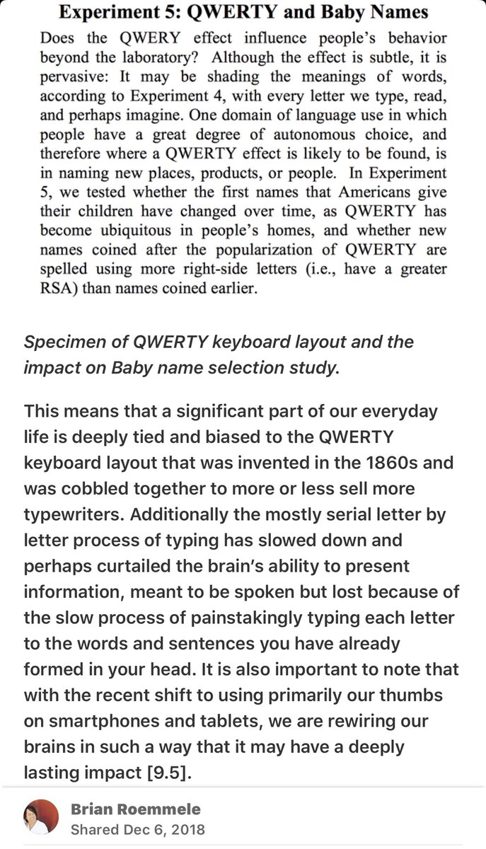 Finally contemplate this: The QWERTY keyboard layout had an impact on baby names since the rise of the computer. This means a significant part of our everyday life is deeply tied and biased to the QWERTY keyboard layout that was invented in the 1860s and impacting us in 2019. https://twitter.com/BrianRoemmele/status/1206778222270042112 …pic.twitter.com/dY9nLPtRRf