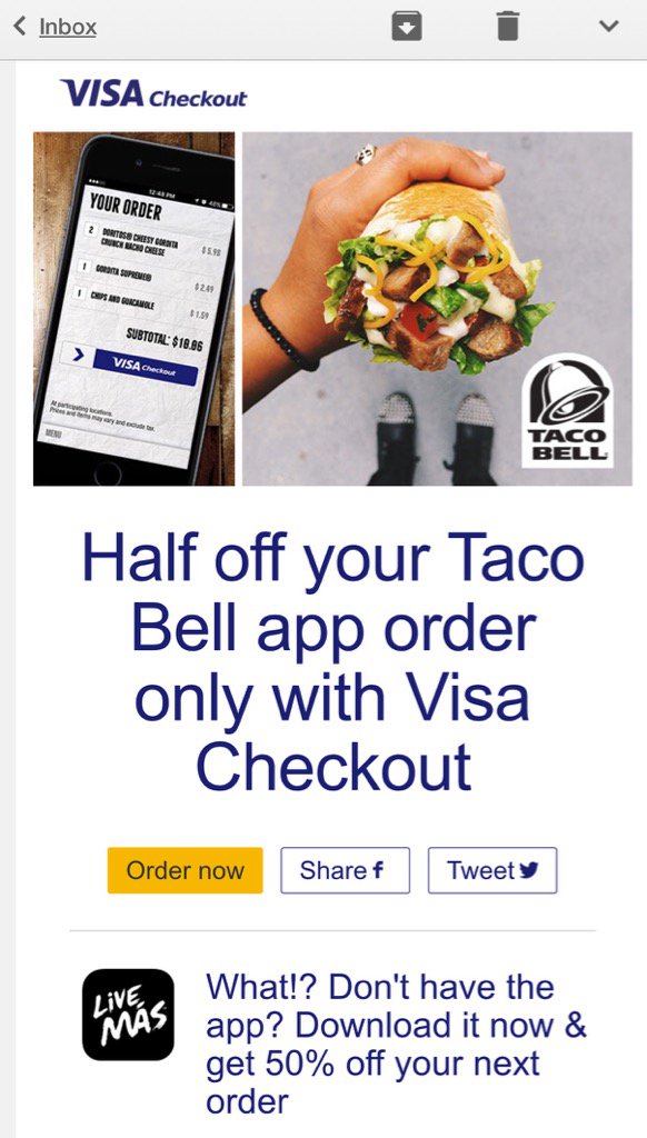 Visa Checkout is rapidly moving to encourage usage. Exampled here with the new Taco Bell promotion.pic.twitter.com/cVvoAfh7AU