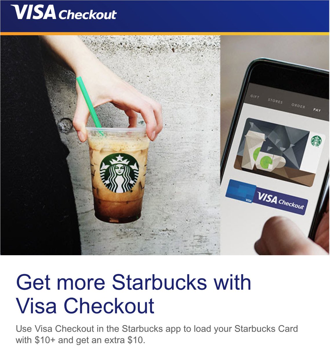 The outstanding @VisaCheckout + @Starbucks offer. Buy $10 get $10.