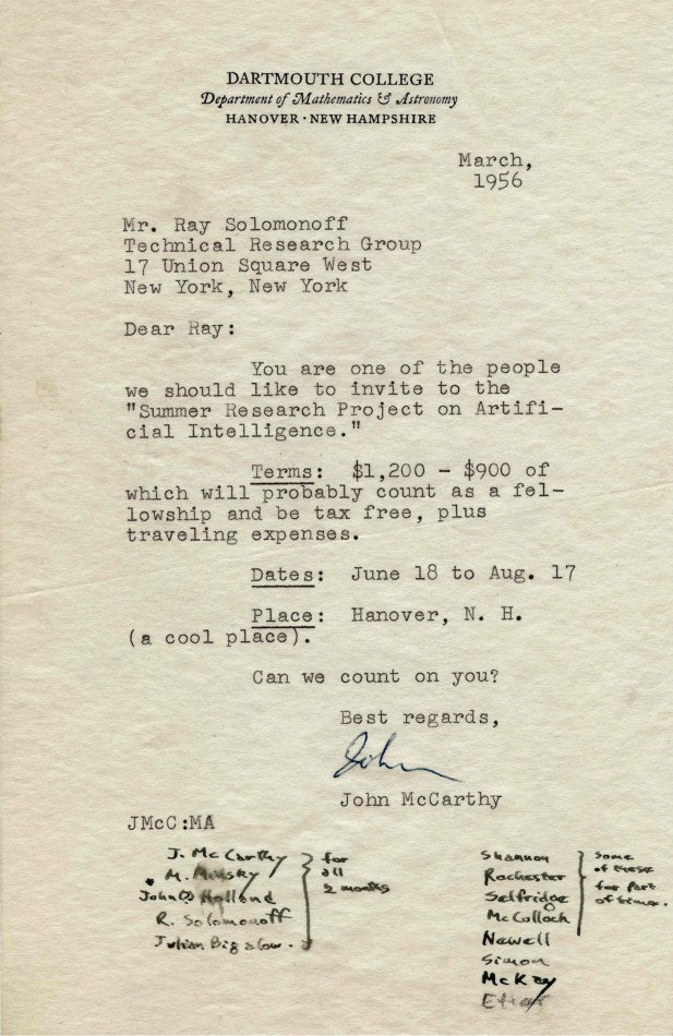 This is the historic invite for the "Dartmouth Summer Research Project on Artificial Intelligence" in 1956. It started the AI revolution.pic.twitter.com/xPkVBoV4qE