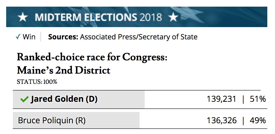 It's official, Jared Golden wins the 2nd district with over 50 percent of the vote after the final vote retabulation: https://bit.ly/2Q5pjD6
