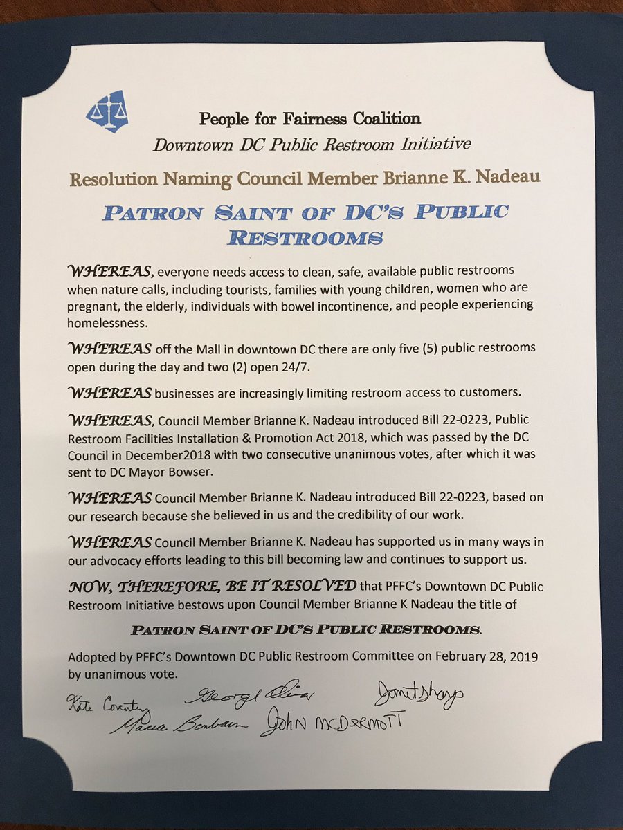 Thanks to the good folks at @WashingtonPffc and @DCrestrooms for this honor and for your instrumental efforts in getting our new public restrooms law on the books.pic.twitter.com/broxmZ9nKF