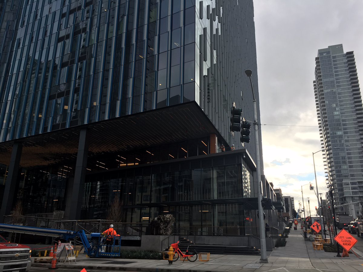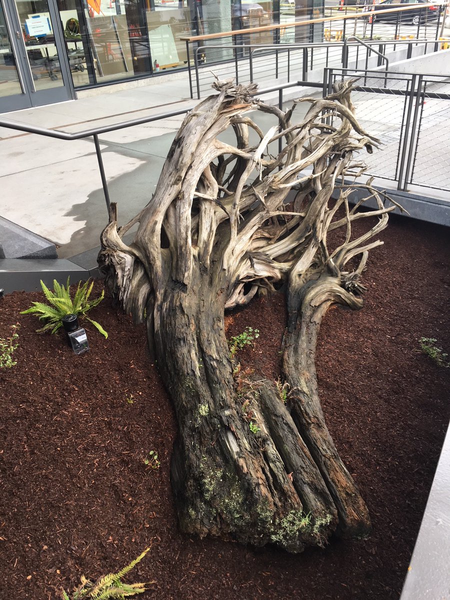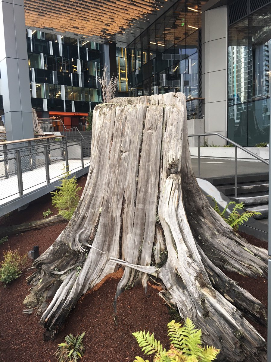 @Amazon's new Bell St. headquarters building. Bits of Northwest forest may prompt thoughts of hiking, or of how much Seattle's changed in 200 years. Or wishing to be in actual woods, not the AMZN jungle. One even has logging notches:pic.twitter.com/C1l8h8jphR