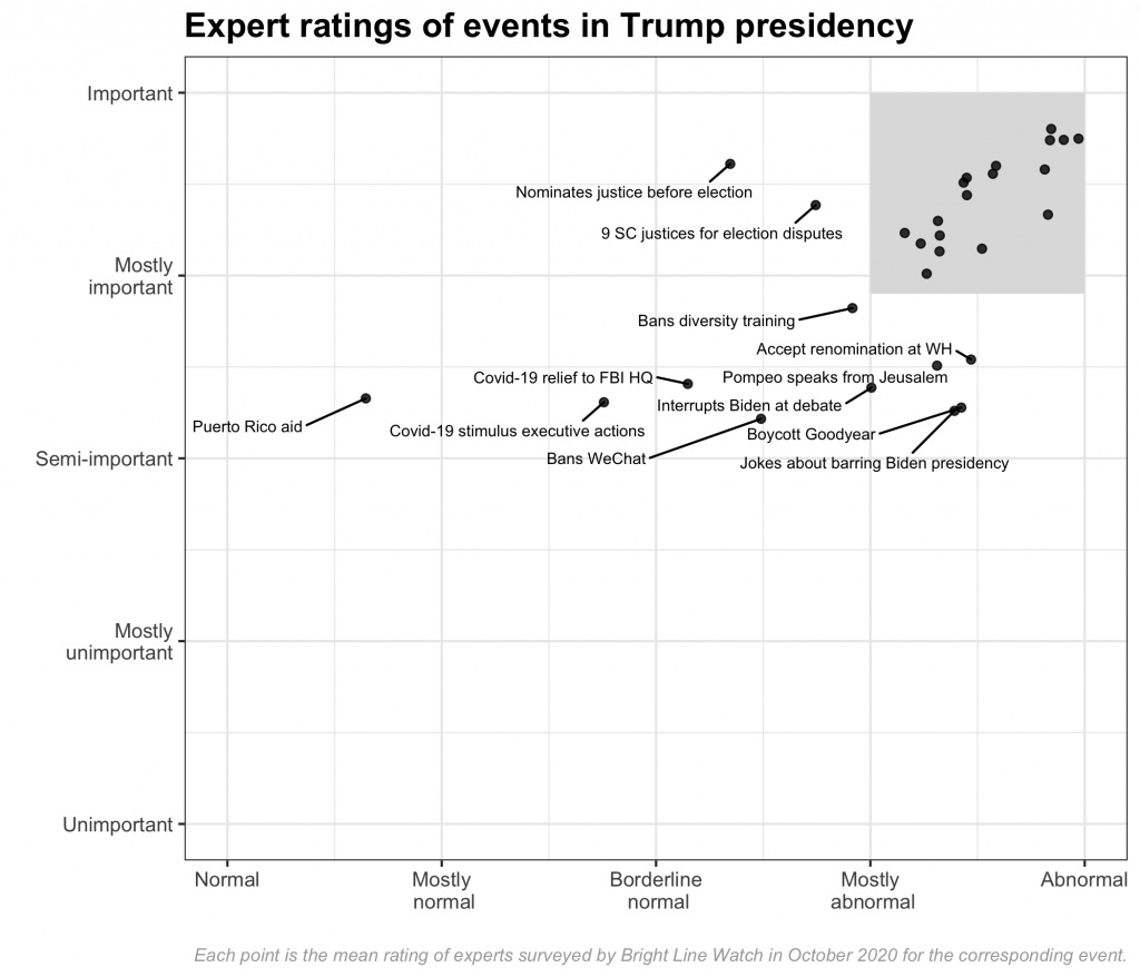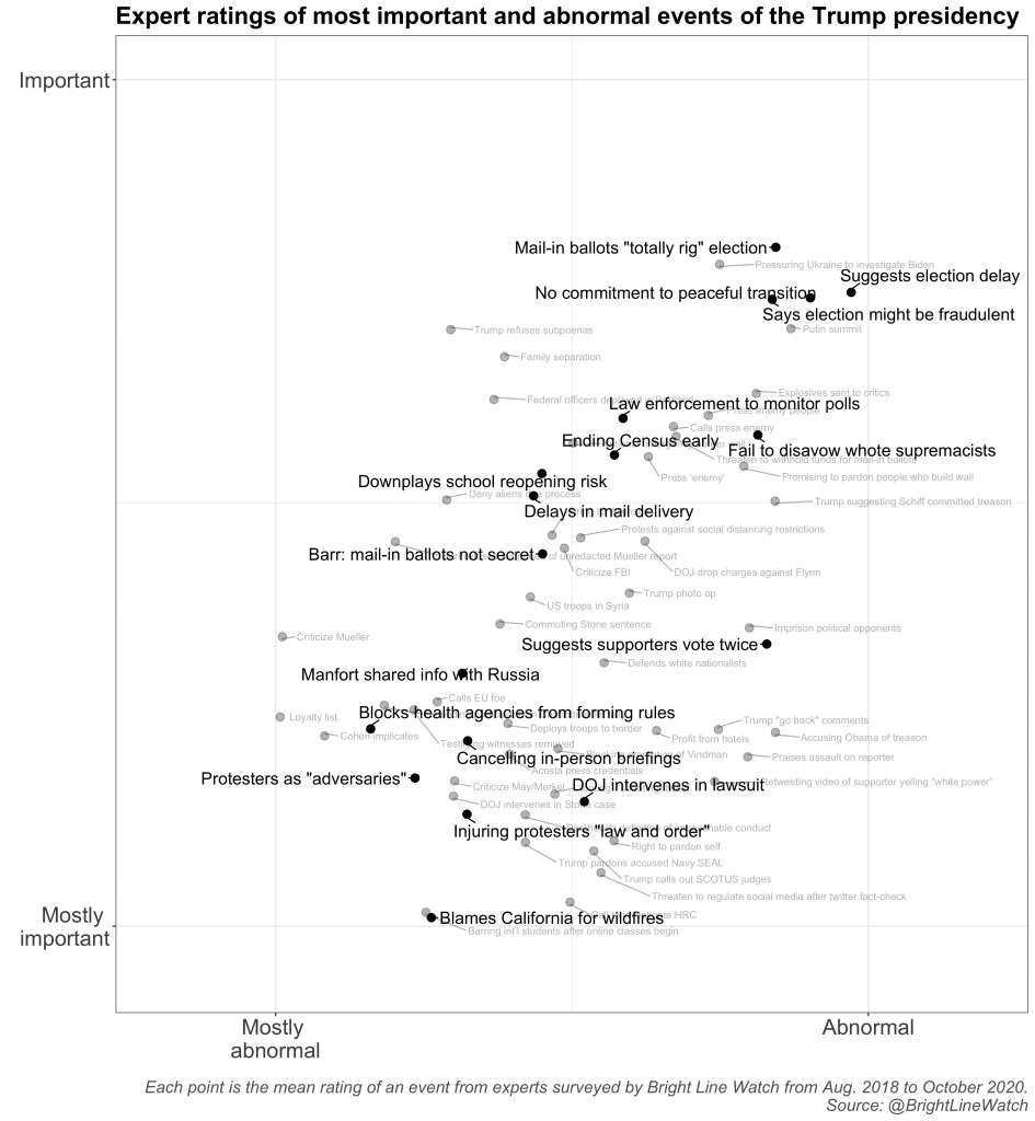 Experts rate President Trump’s statement that the 2020 election should be delayed and his refusal to commit to a peaceful transfer of power as the most important and abnormal of the 169 events they have rated over the course of his presidency http://brightlinewatch.org/american-democracy-on-the-eve-of-the-2020-election/ …pic.twitter.com/JYenFvbcBL
