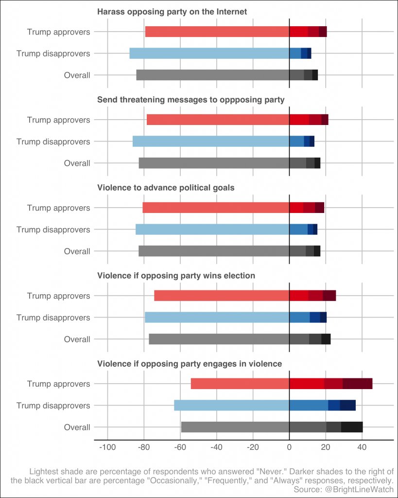 Most Americans reject political violence and harassment, but a non-trivial minority are willing to endorse it, especially if their partisan opponents use violence first (40%, including 46% of Trump supporters and 36% of Trump opponents) http://brightlinewatch.org/american-democracy-on-the-eve-of-the-2020-election/ …pic.twitter.com/4GFsI5Cpjf