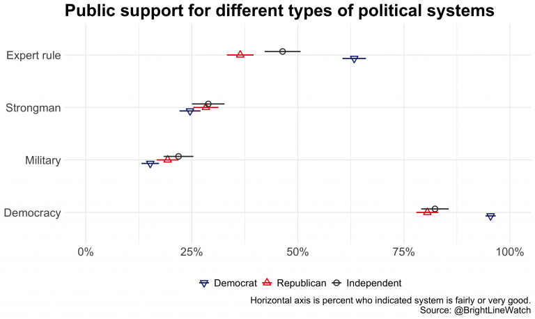 Democracy remains the public's preferred method of governance, though Rs and Is demonstrate less uniform support (81% and 82% vs 94% for Ds). Few in any party favor strongman rule and even fewer welcome military rule. Ds are more supportive of expert rule. http://brightlinewatch.org/american-democracy-at-the-start-of-the-biden-presidency/ …pic.twitter.com/JDYIGvXLj3