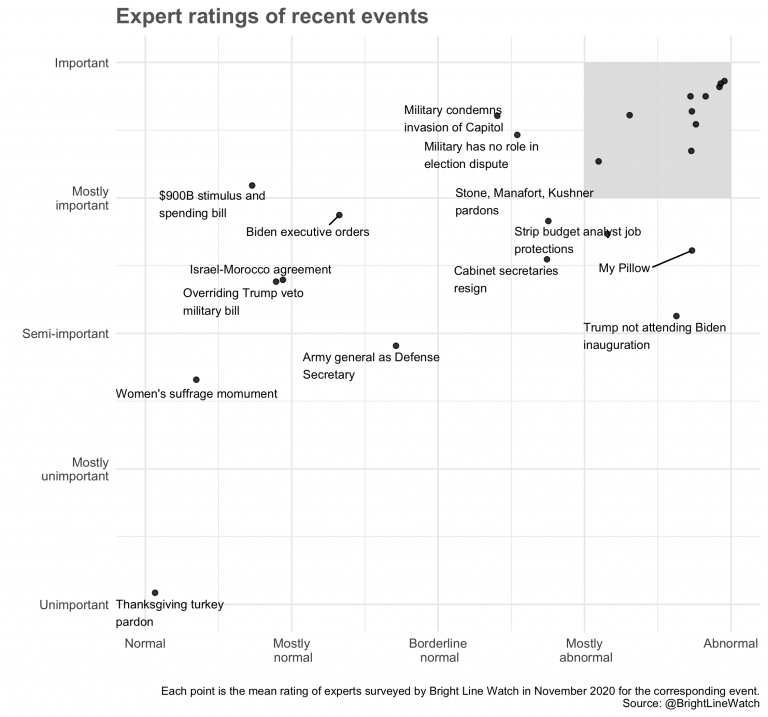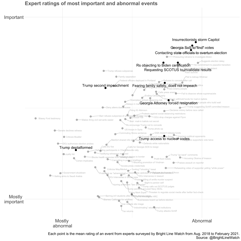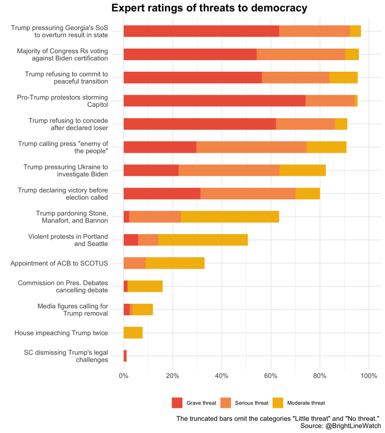 Experts rate the insurrection and Trump’s pressure on state officials to overturn the election as among the most abnormal and important events of his presidency and identify them as grave or serious threats to American democracy. http://brightlinewatch.org/american-democracy-at-the-start-of-the-biden-presidency/ …pic.twitter.com/5Yc5ZH1W6n