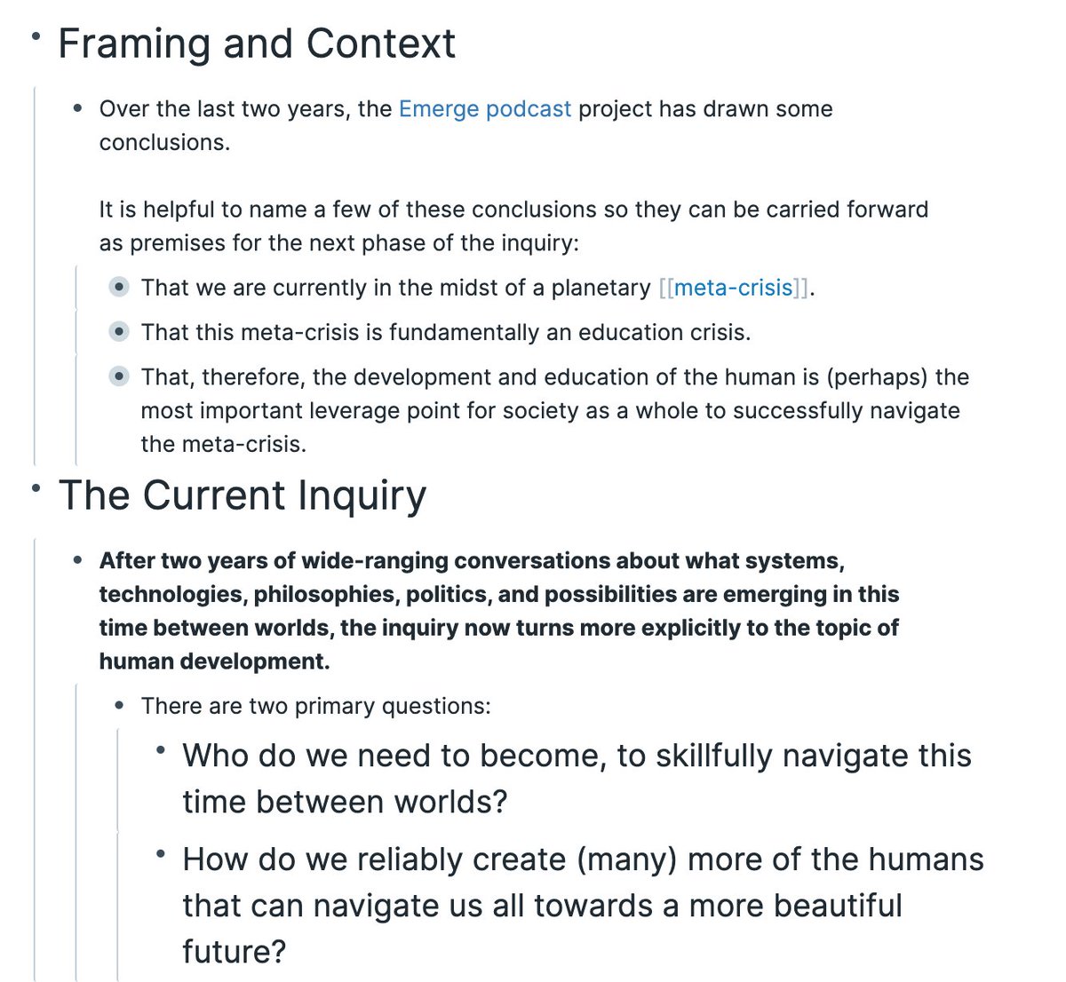 Continuing to refine the inquiry of the Emerge podcast for the coming year. Check out the living document I made: https://roamresearch.com/#/app/dthorson/page/Y2embI4fk … I send it to folks I invite to the show. What do you think? Any questions or angles you'd add?pic.twitter.com/YPNcoAnhtv