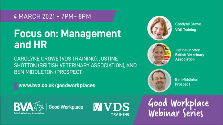 #TeamVet - come along to our next#GoodWorkplaces webinar which will be all about management and HR. Hear from BVA Junior Vice President@justineshotton,@CroweCarolyne@VDStraining and Ben Middleton from Prospect. Register online: http://www.bva.co.uk/goodworkplaces pic.twitter.com/oHEES6nkER
