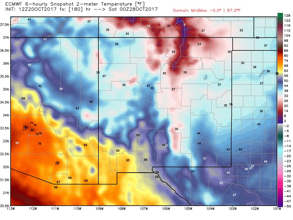 Our first taste of real winter could be a week away. Look at the temps next Friday afternoon. Statewide deep free possible. #nmwx pic.twitter.com/jfLqZ8KI2a