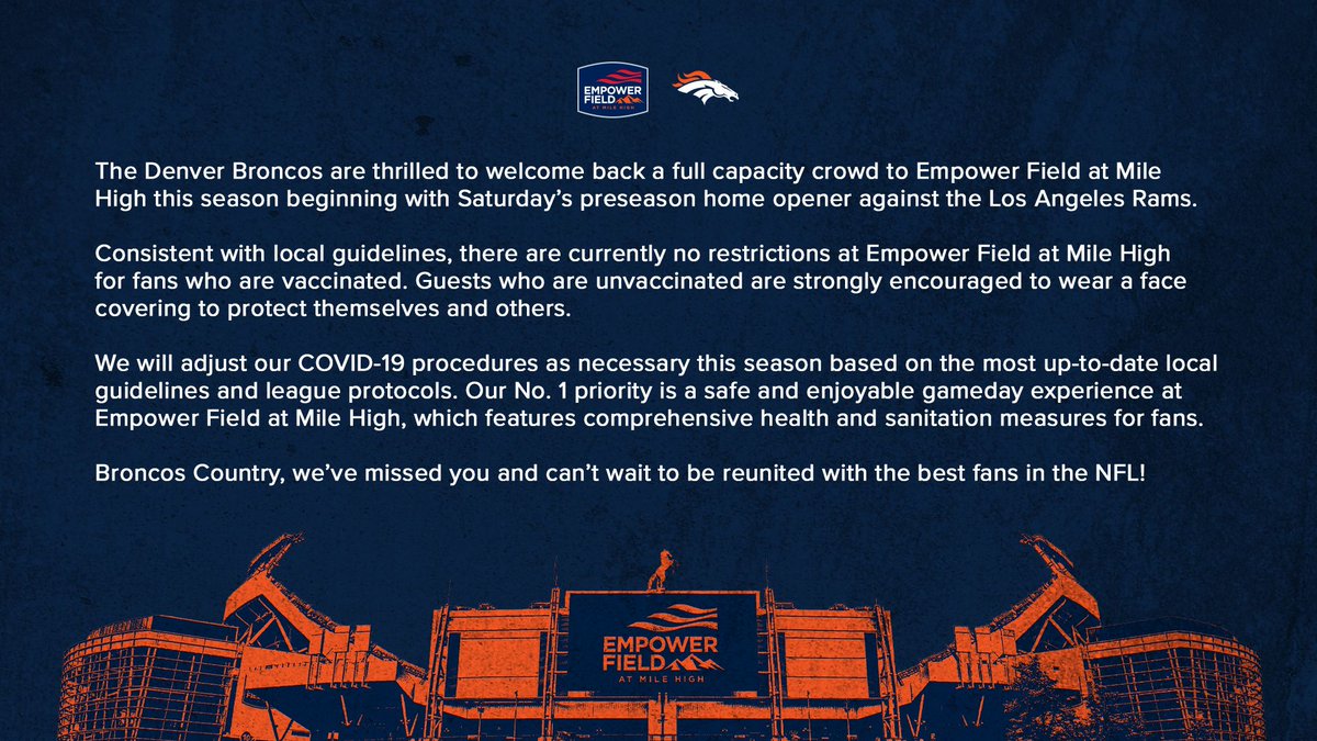 #BroncosCountry, we can’t wait to see you on Saturday at@EmpowerField for#LARvsDEN! For more Know Before You Go information that includes the latest COVID-19 protocols, visit » https://j.mp/3mpeWcX pic.twitter.com/8kG4lI4fko