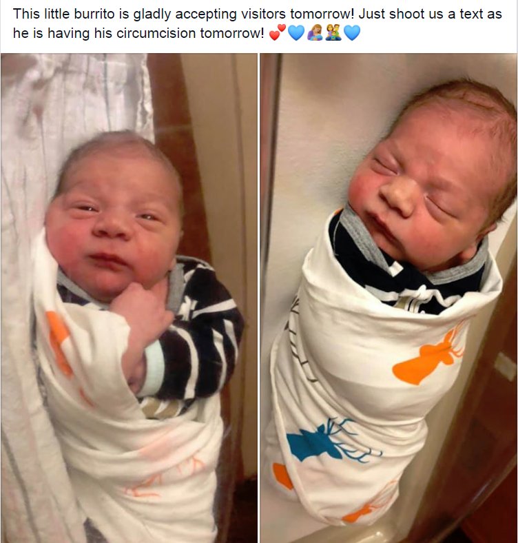"This little burrito is gladly accepting visitors tomorrow! Just shoot us a text as he is having his #circumcision tomorrow!