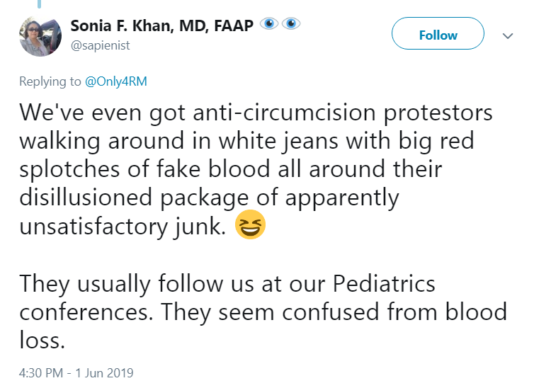 Here's an Establishment Goon, "MD" laughing at blood loss from #circumcision #i2 This individual saw @BloodstainedMen at yesterday's #CADEM19 @CA_Dem convention in SF https://twitter.com/sapienist pic.twitter.com/n7wdBhJKpM