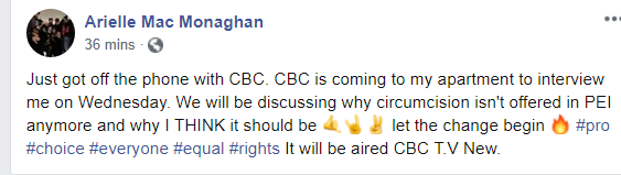 A social media report that one can't get their child #circumcised on Prince Edward Island, a Canadian province. "CBC is coming to my apartment to interview me.... why #circumcision isn't offered in PEI anymore ....let the change begin 🔥 #pro #choice #everyone #equal #rights #i2pic.twitter.com/g5yvUrc3PZ