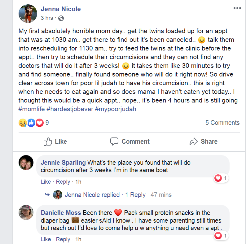 "So drive clear across town for poor lil judah to have his circumcision.. this is right when he needs to eat again and so does mama I haven't eaten yet today.. I thought this would be a quick appt.. nope.. it's been 4 hours and is still going #momlife #hardestjobever #mypoorjudah
