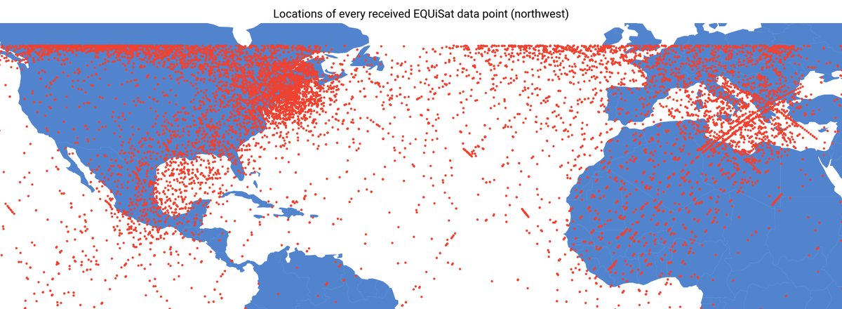This is a map of the locations of every data point ever received from EQUiSat (i.e. the satellite's location when the data point was recorded). EQUiSat is configured to send data recorded throughout the past orbit in every downlink, allowing us to get data from around the world!pic.twitter.com/TtI5gCjD56