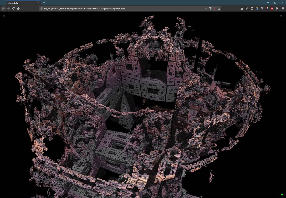 MengerBulb (or MandelSponge) #WebGL #RayMarching #DistanceExtimation intersection between #MandelBulb #fractal and #MengerSponge Sources https://github.com/BrutPitt/wglRayMarchedFractals/tree/master/WebGL/MengerBulb … Live WebGL https://brutpitt.github.io/wglRayMarchedFractals/WebGL/MengerBulb/MSponge.html …pic.twitter.com/JO5aAWF68d