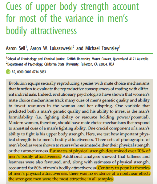 “The rated strength of a male body accounts for 70% of the variance in attractiveness. None of the women produced a preference for weaker men...in both samples, the strongest men were the most attractive, the weakest men were the least attractive.” https://royalsocietypublishing.org/doi/pdf/10.1098/rspb.2017.1819 …pic.twitter.com/HoHVwZKRY7