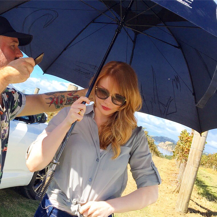 Behind the scenes in New Zealand--admiring the gorgeous weather from under this giant umbrella.