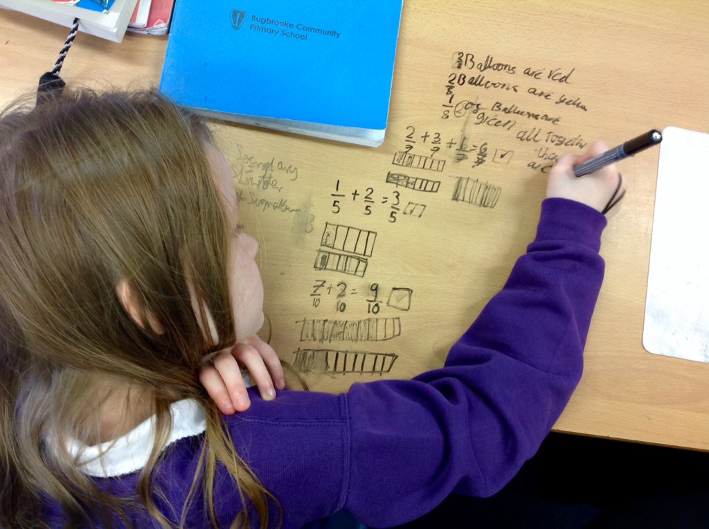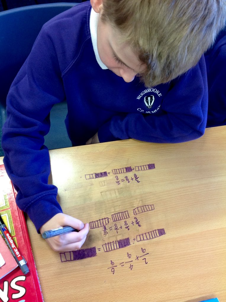 Year 5 have been very busy in Maths today and have begun to add and subtract fractions. We are using models and drawings to support our understanding, whilst looking at the numerators and denominators. We love to draw on the tables!pic.twitter.com/ph2VdzdnpT