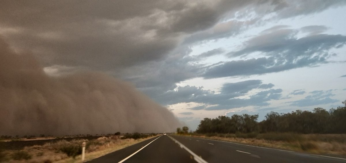 Wow. Massive dust storm outside of Moree. We got caught in it with visibility down to -1 m. Intense winds and lots of debris. Then through a smoke storm. Then a lightening storm. Then torrential rain. All in the space of an hour.pic.twitter.com/YDwbVQVhrb