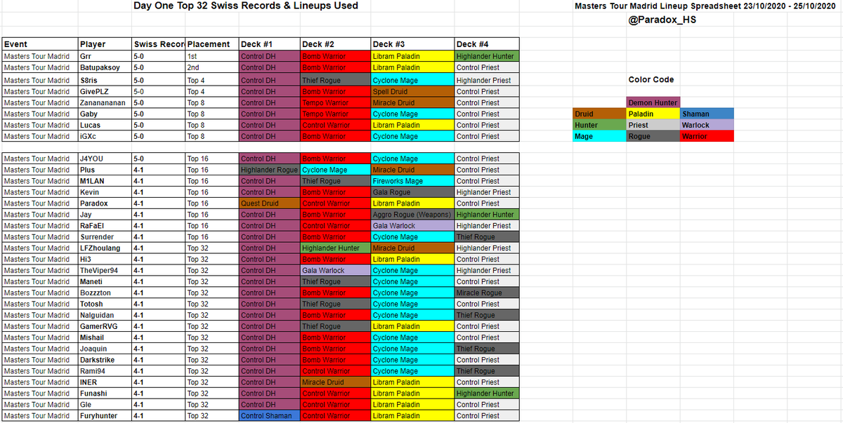 Good morning everyone. As usual here are the lineups everyone in the Top 32 for #MTMadrid were using for Day One.