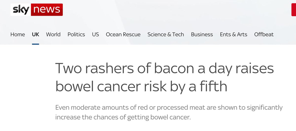 Risk of bowel cancer increased from 0.4% in those who reported that they consumed 21 grams of red and processed meat a day to a WHOPPING 0.48% in those who reported 76 grams. Causality remains unknown as the study design was non-experimental. News headlines:pic.twitter.com/WW9dC2AKYr