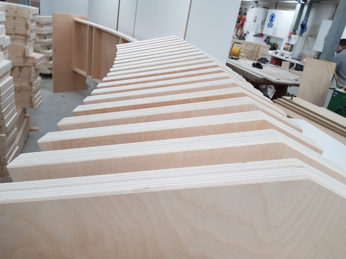 @WellingtonUK PAC project constructed by@Beard_Construct we've been on a factory visit. Each of these ply fins has a 1.36 degree taper so that they go around the curve. There are nearly 600 of them all at different angle of slope between 9 and 20 degrees.pic.twitter.com/IjKoq9T5tM