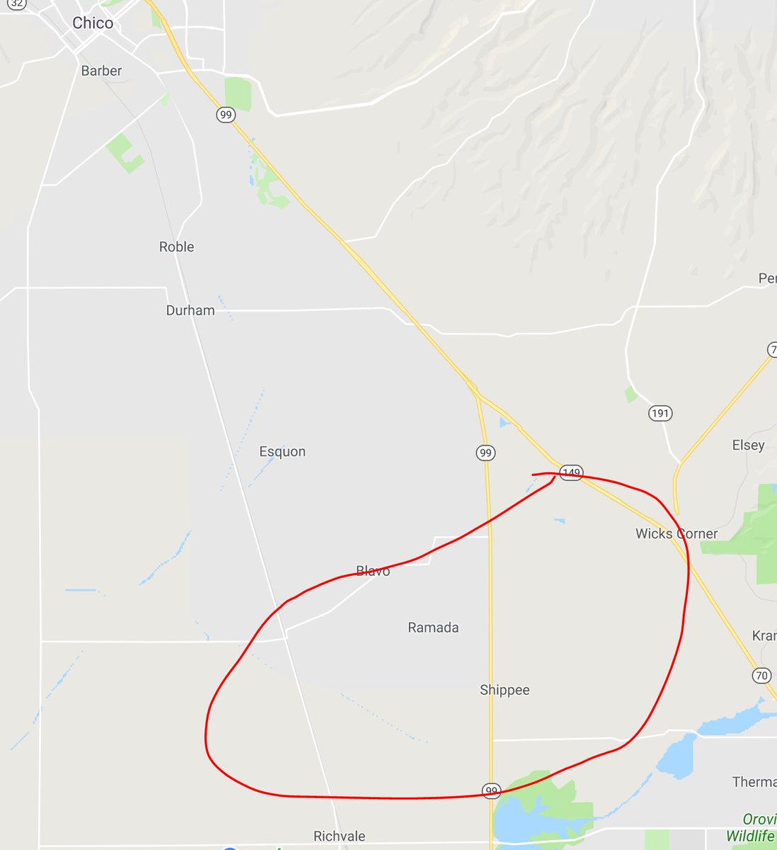 This includes Shippee Rd, Dove Ridge Rd, Schlaf Dr, Clearwater Lane, Cottonwood Road, Table Mountain Overcrossing, Nelson Ave, Tres Vias Rd, Wilbur Rd, Oro Dam Blvd , Grand Ave, 21st St, Gold Country Ln, Biggs Ave, 20th ST, 18th St, 14th St, 12th St, 10th St, 7th St