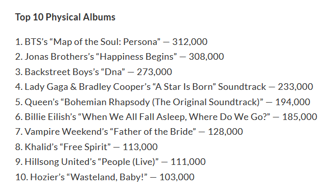 Best selling albums of 2019 (US physical) 1. Map of the Soul: PERSONA 2. Happiness Begins 3. DNA 4. A Star Is Born 5. Bohemian Rhapsody 6. WHEN WE ALL FALL ASLEEP, WHERE DO WE GO? 7. Father Of The Bride 8. Free Spirit 9. People (Live) 10. Wasteland, Baby!