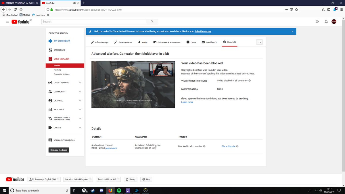 @ATVIAssist @TeamYouTube Are you guys kidding me? I play a game that i payed for on stream and it gets blocked worldwide because of a cutscene in the campaign (which is unskippable so even if i did know what could i do about it) of advanced warfare... wtf....pic.twitter.com/NnBRRIHAkI