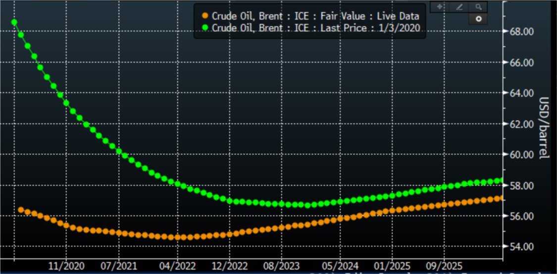 #oil demand losses mount in China due to the#CoronaVirus, the Brent curve (orange) has flattened notably vs a month ago (green). Whoever was short time-spread made some nice money. Front-month is still backwardated by a few cents, nonetheless |#OOTT@TheTerminalpic.twitter.com/KWa5MJWXP5