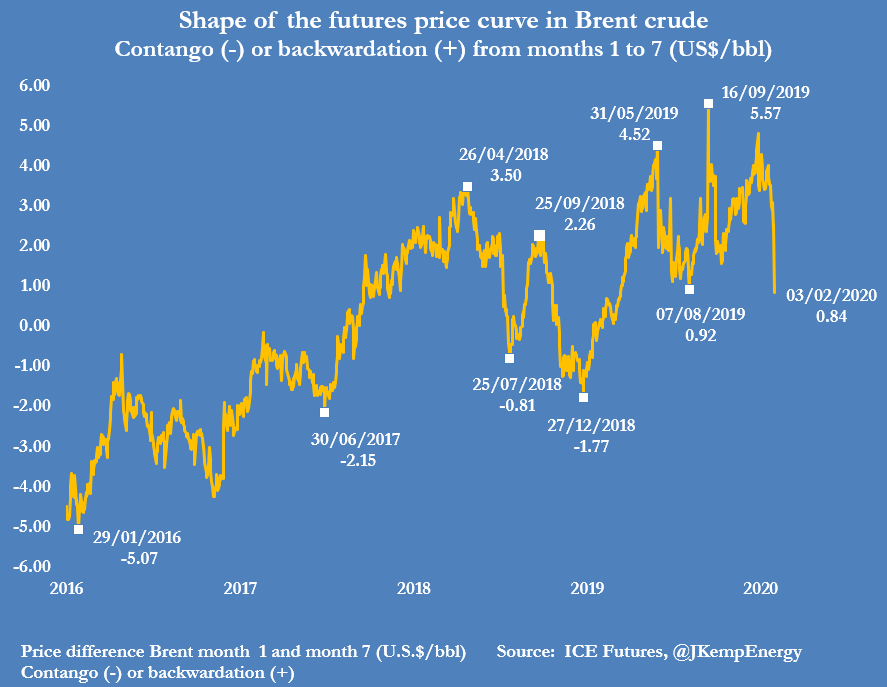 BRENT’s six-month calendar spread has collapsed to just 84 cents backwardation from more than $4 at the start of last month, as traders anticipate a big hit to consumption from the coronavirus outbreak and plentiful short-term crude availability:pic.twitter.com/RRic9HO4Kw