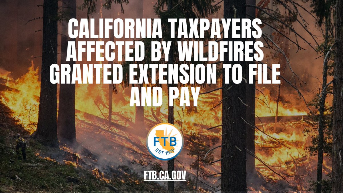 California Taxpayers Affected by September Wildfires Granted Extension to File and Pay. For more info visit: https://www.ftb.ca.gov/about-ftb/newsroom/index.html …pic.twitter.com/w6Ywzsk8kL