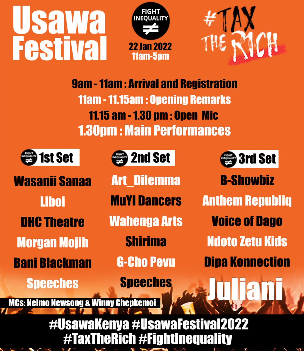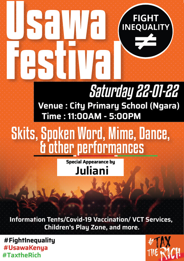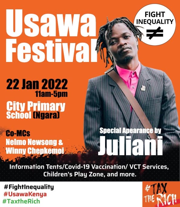 #UsawaFestival2022@JulianiKenya will be gracing it with special appearance. Usikose kucheki Juliani and other artists wakiperform kesho pale City Primary Ngara tukichant#TaxTheRich.#UsawaKenya#TaxTheRich#FightInequalitypic.twitter.com/momApXyhFL