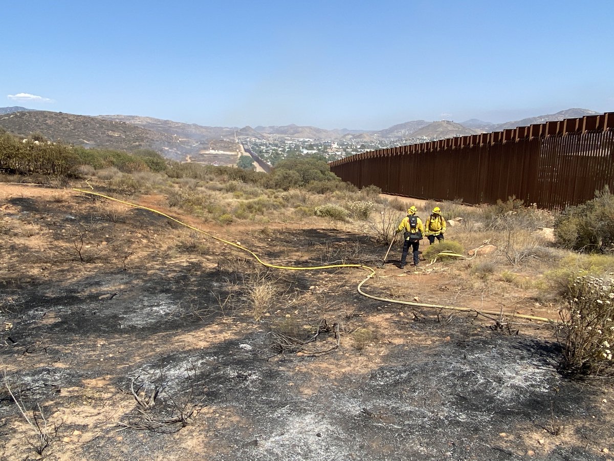 #BorderFire [update] Fire spread has been stopped. Cause was determined to be an electrical failure (powerlines down) in Mexico right along the border fence that quickly spread to vegetation on the U.S. side of the border. Firefighters will remain at scene through the evening.pic.twitter.com/27MNX2pliU